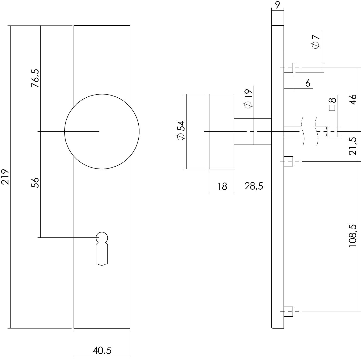 Knop op rechthoekig schild sleutelgat 56 mm rvs geborsteld